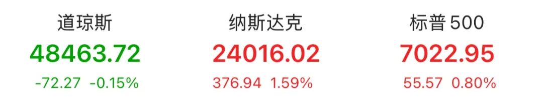 和平谈判乐观情绪叠加美股财报季积极开局,标普、纳指强势收涨至历史高位,道指则逆势收跌。截至收盘,标准普尔500指数涨0.8%,报7022.95点;纳斯达克综合指数涨1.59%,报24016.02点,为连续第十一个交易日上涨;道琼斯工业平均指数跌0.15%,报48463.72点。