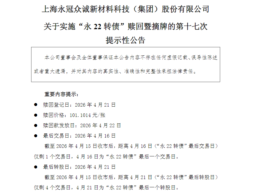 4月15日,永冠新材发布关于实施“永22转债”赎回暨摘牌的第十七次提示性公告,提醒投资者4月16日为永22转债最后一个交易日,4月21日是最后一个转股日,债券持有人应及时卖出或转股。4月21日收市后,未实施转股的远信转债将全部冻结,停止交易和转股。