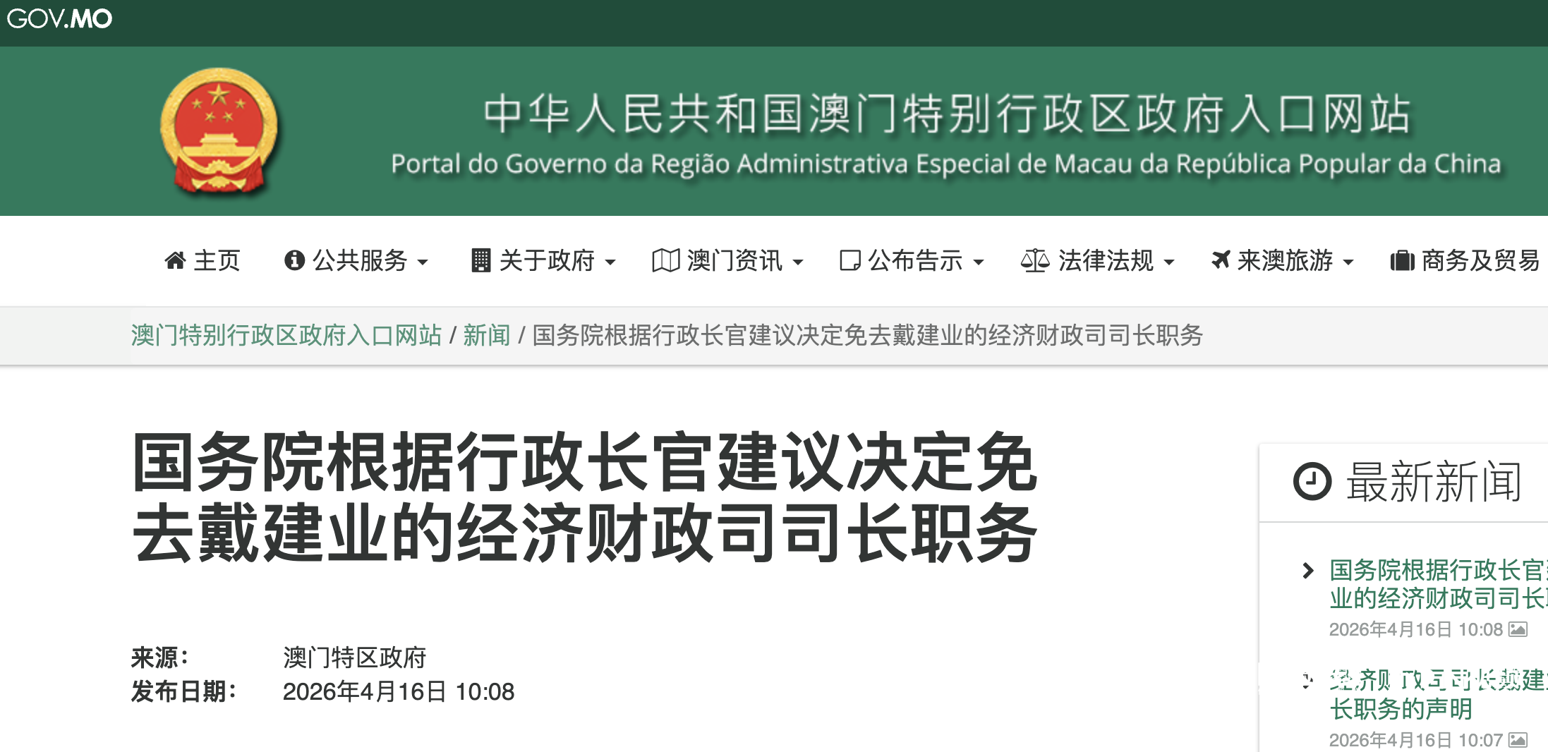 南都讯 据澳门特区政府消息,国务院4月16日公布,中央人民政府依照《中华人民共和国澳门特别行政区基本法》的有关规定,根据澳门特别行政区行政长官岑浩辉的建议,决定免去戴建业的经济财政司司长职务。
