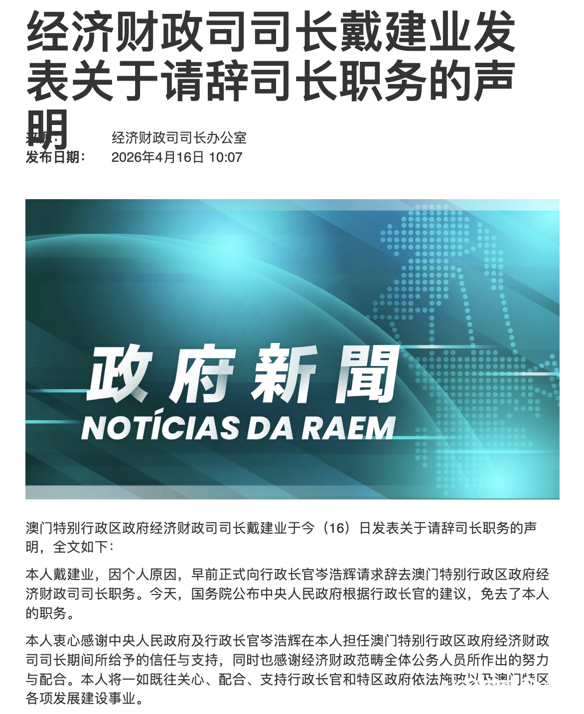 新闻通报表示,早前戴建业司长因个人原因向行政长官岑浩辉提出辞职请求。行政长官根据《中华人民共和国澳门特别行政区基本法》第五十条第(六)项的规定,向中央人民政府建议免除戴建业的经济财政司司长职务。