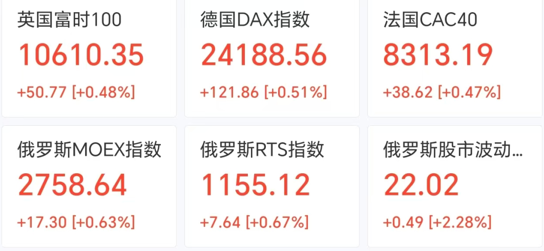 4月16日,欧洲主要股市开盘全线走高,截至18:45左右,德国DAX指数、英国富时100指数、法国CAC40指数均涨约0.5%。美股三大期指集体飘红,昨日纳指、标普500指数已创新高。