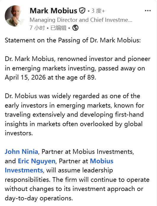 麦朴思的领英页面显示,知名投资者、新兴市场投资先驱麦朴思(Mark Mobius)于2026年4月15日去世,享年89岁。