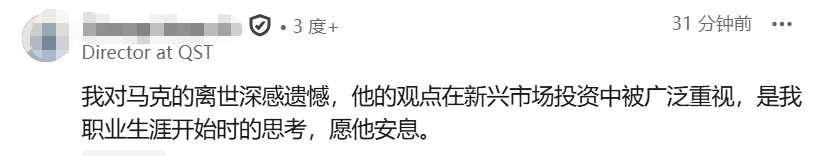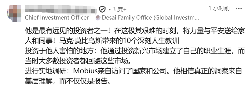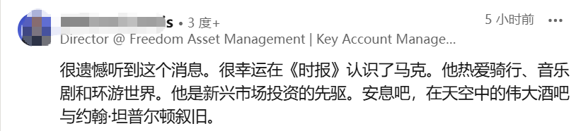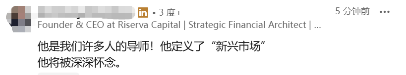 图片来源:麦朴思领英账号 领英用户纷纷留言:“新兴市场投资的真正先驱”“他定义了‘新兴市场’”“最有远见的投资者之一”“他将被深深怀念”。