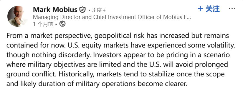 一个月前,麦朴思的领英账号还在发布市场观点。他提到,从市场角度看,地缘政治风险有所增加,但目前仍受控。投资者似乎在定价军事目标有限、美国将避免长期地面冲突的局面。美国股市经历了一些波动,但并不算无序。历史上,一旦军事行动的范围和可能持续时间明朗,市场往往趋于稳定。