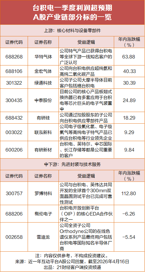 而从产业链方面来看,A股已有多家公司与台积电进行业务合作。21快讯记者从互动平台梳理了解到,近一年来,已有10余家企业明确回复与台积电相关业务的联系,涵盖产业上下游关键环节。其中,上游核心材料与设备零部件层面,相关企业股价均录得年内正增长。值得注意的是,大牛股罗博特科曾公开表示,与台积电、英伟达共同开发的全球首个300mm双面晶圆测试平台已完成可靠性测试,该公司股价2026年已实现翻倍。