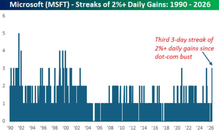 更引人注目的复苏来自传统软件和云计算巨头微软。公司在短短3个交易日里上涨11%,市值增加近3000亿美元。市场研究公司Bespoke的统计显示,本周也是老牌科技巨头自互联网泡沫破灭以来,第三次出现连续三日涨幅均超过2%的情况。