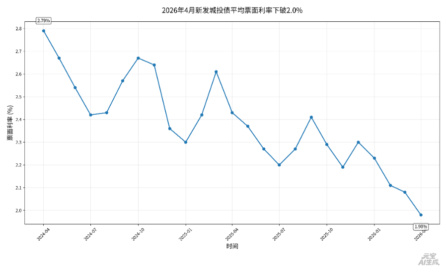 步入4月,在融资成本持续下行背景下,企业预警通数据显示,全国城投债券的平均票面利率已跌至1.97%的历史低位,并正式下破2.0%关口。