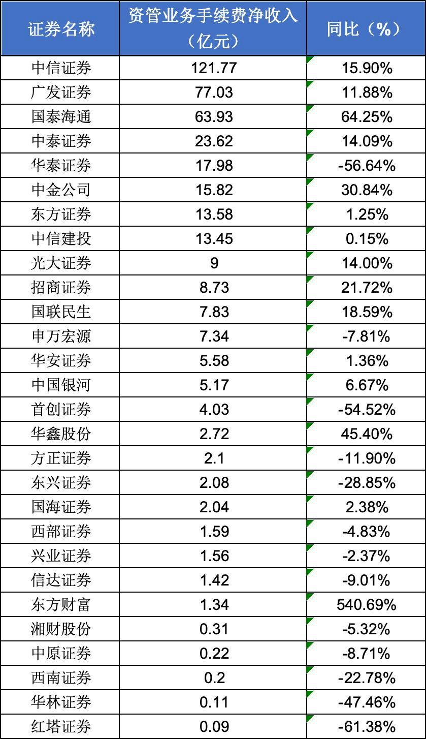 Choice数据显示,截至目前,有8家券商资管业务手续费净收入超过10亿元。