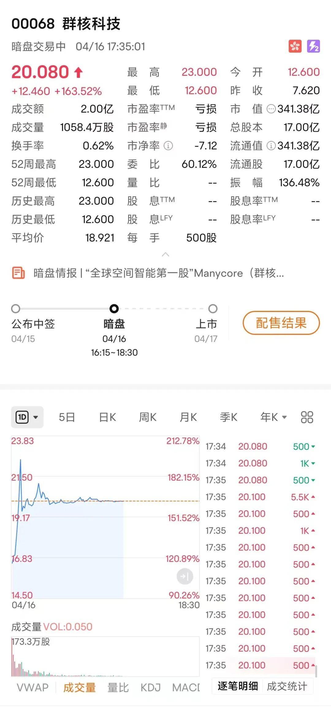 4月16日,群核科技暗盘交易火热。富途证券数据显示,群核科技暗盘一度涨超200%,最高报23港元/股。