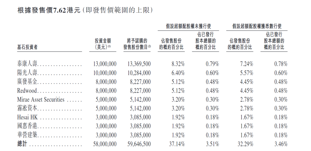 招股书显示,本次全球发售获得多家知名长线险资、头部公募基金、国际资管机构等“抢筹”,泰康人寿、阳光人寿、广发基金、Redwood、Mirae Asset、雾凇资本等均为其基石投资者,合计认购约4.55亿港元。
