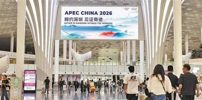 深圳机场内多块屏幕持续滚动展播喜迎APEC。 深圳特区报记者 毕晗 摄