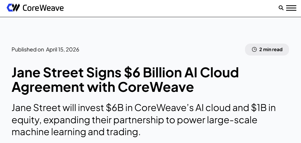 4月15日,量化巨头简街(Jane Street)宣布,向人工智能云服务提供商CoreWeave再增资10亿美元,并与该公司签订近60亿美元的云服务协议。