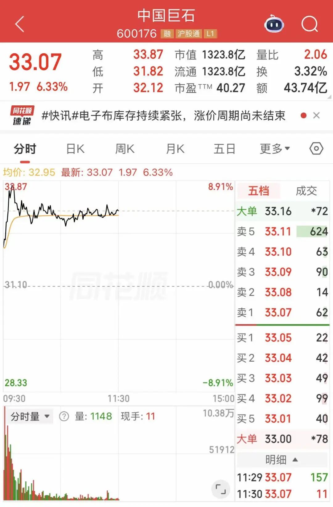 4月16日,电子布龙头中国巨石盘中股价震荡上行,截至午间收盘,报33.07元,涨超6%,换手率3.32%,成交额43.74亿元,总市值超1300亿元,表现强势领跑板块。与此同时,玻纤板块整体回暖,板块内多只个股同步跟涨,资金做多热情持续释放。