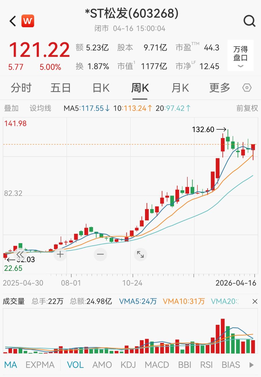 截至4月16日收盘,*ST松发股价达121.22元,近一年涨超200%,市值为1177亿元。