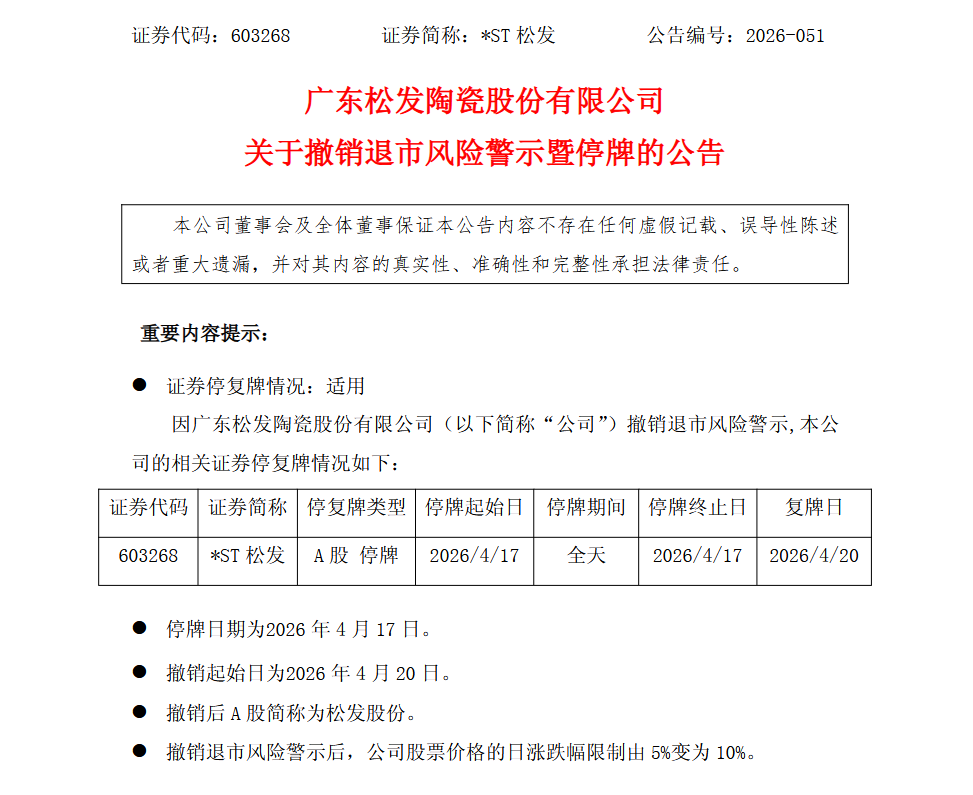 4月16日,*ST松发(603268.SH)公告称,公司股票将于4月17日停牌一天,自4月20日起复牌交易并撤销退市风险警示。证券简称由“*ST松发”变更为“松发股份”,证券代码仍为603268,股票价格的日涨跌幅限制由5%变为10%。