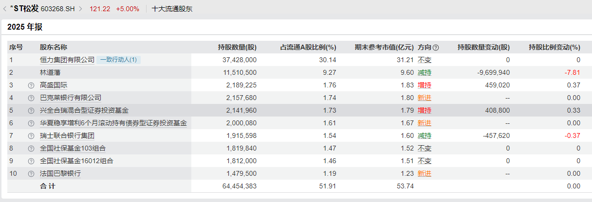截至2025年12月31日,社保基金一零三组合位列*ST松发第八大股东,博时基金管理有限公司-社保基金16012组合位列第九大股东。