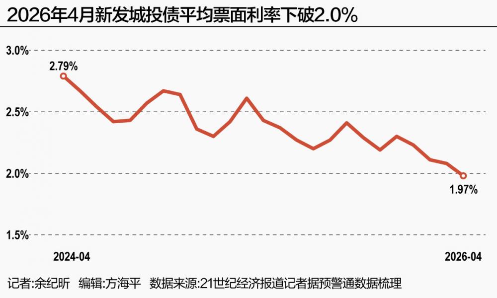 步入4月,在融资成本持续下行背景下,企业预警通数据显示,全国城投债券的平均票面利率已跌至1.97%的历史低位,并正式下破2.0%关口。