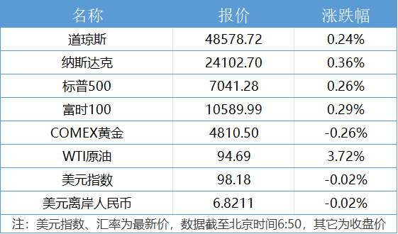 1、美国三大股指小幅收涨,道指涨0.24%报48578.72点,标普500指数涨0.26%报7041.28点;纳指涨0.36%报24102.7点,连续12日上涨;标普500指数、纳指续创新高。威瑞森电信涨近4%,思科涨超2%,领涨道指。万得美国科技七巨头指数持平,微软涨超2%,脸书涨0.79%。纳斯达克中国金龙指数涨1.74%,蔚来涨7%,好未来涨超5%。