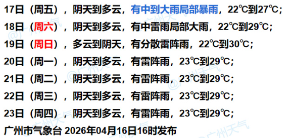 广东省气象台预计,4月17日白天到夜间,韶关南部、清远南部、河源北部、珠三角大部和粤西市县阴天有中到大雨局部暴雨,广东其余市县有雷阵雨局部大雨, 上述地区雷雨时局地伴有8级左右的短时大风。