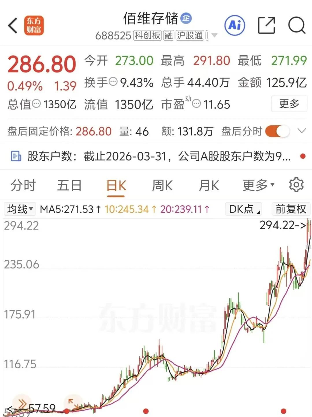截至4月16日收盘,佰维存储报收于286.8元/股,总市值为1350亿元。自2025年下半年以来,佰维存储股价累计涨幅超过3倍。