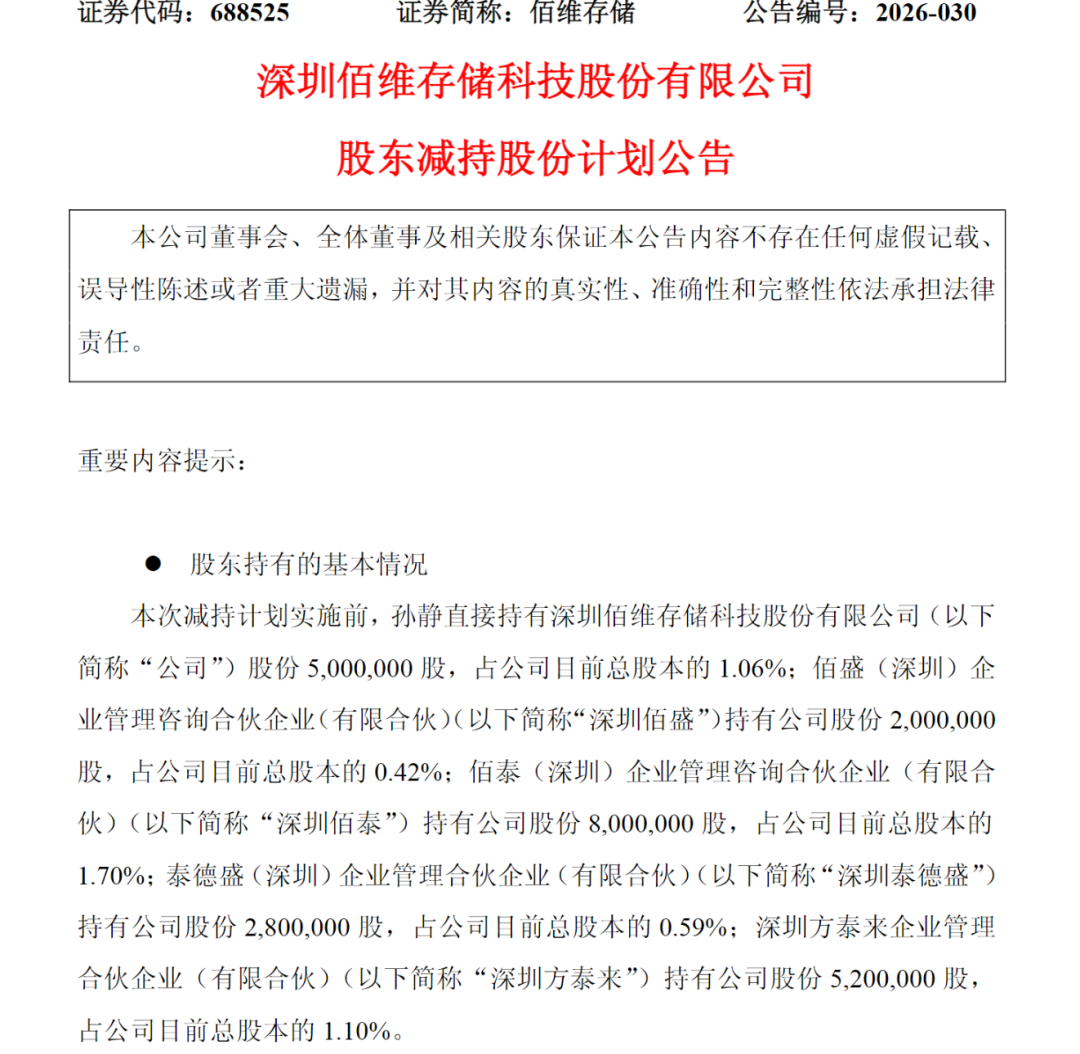 4月16日晚间,佰维存储公告,公司股东孙静、深圳佰盛、深圳佰泰、深圳泰德盛、深圳方泰来计划减持公司股份。