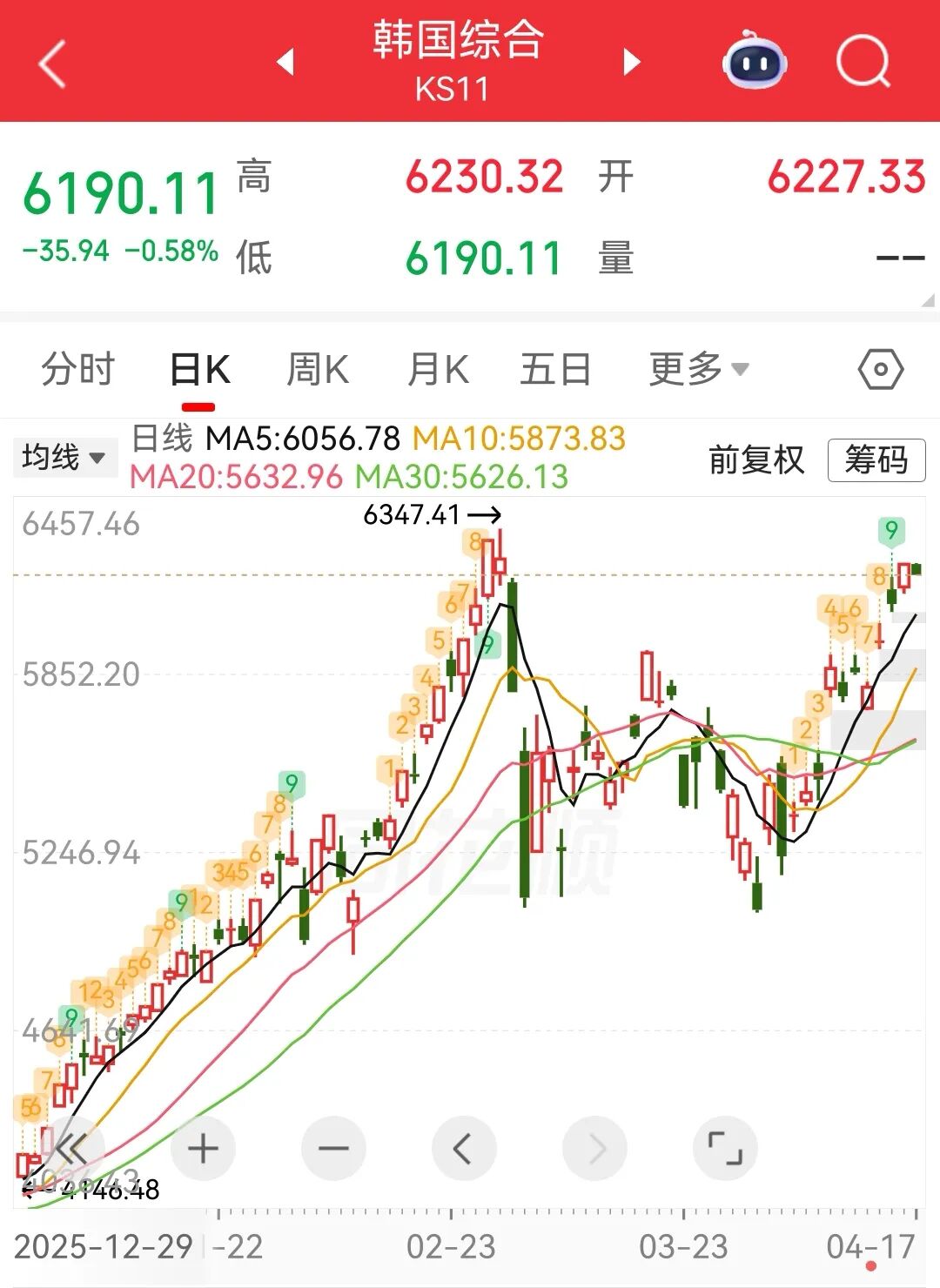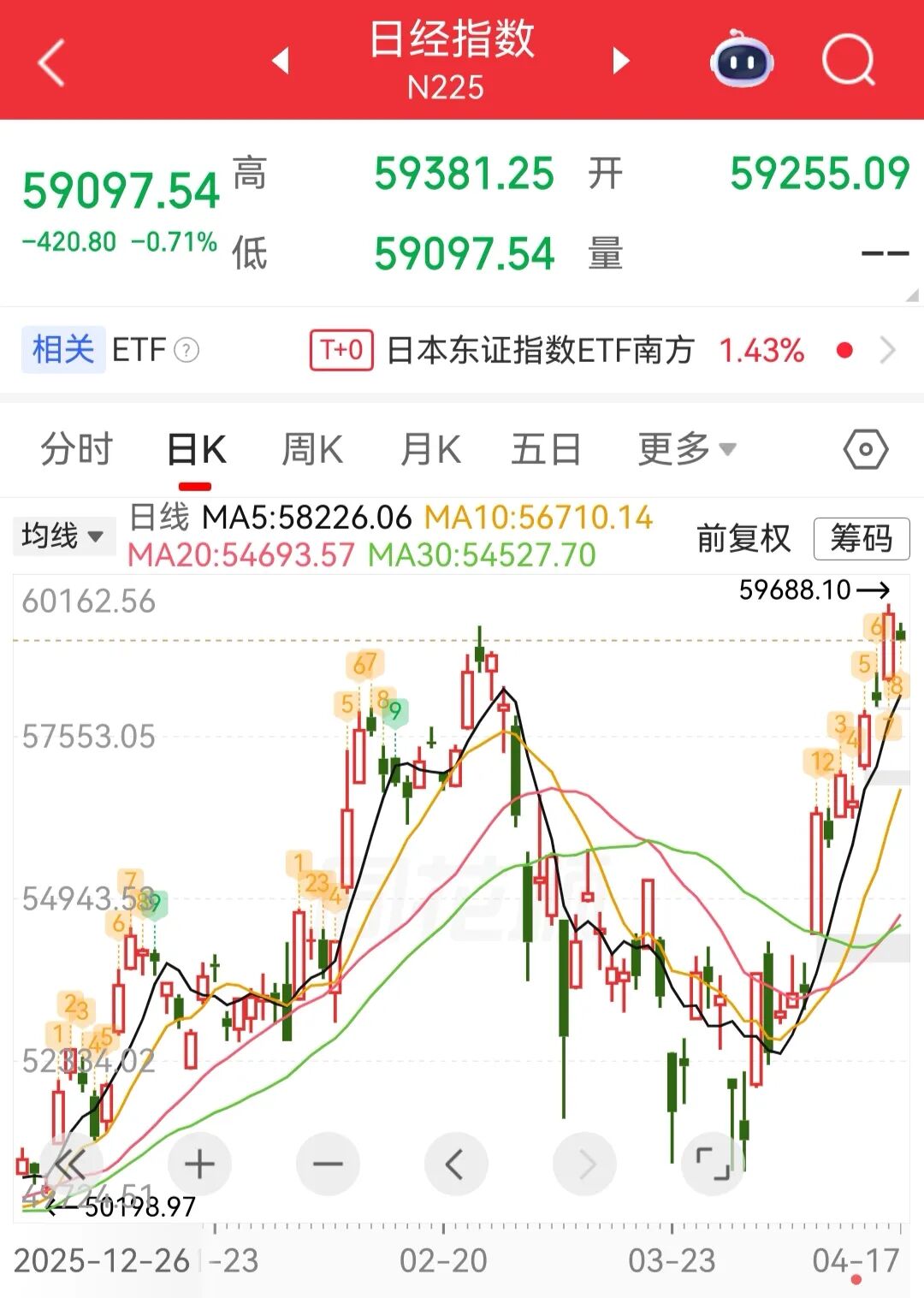 4 月17日, 日经225指数开盘下跌0.44%,报59255.09点;韩国KOSPI指数涨0.02%,报6227.33点。