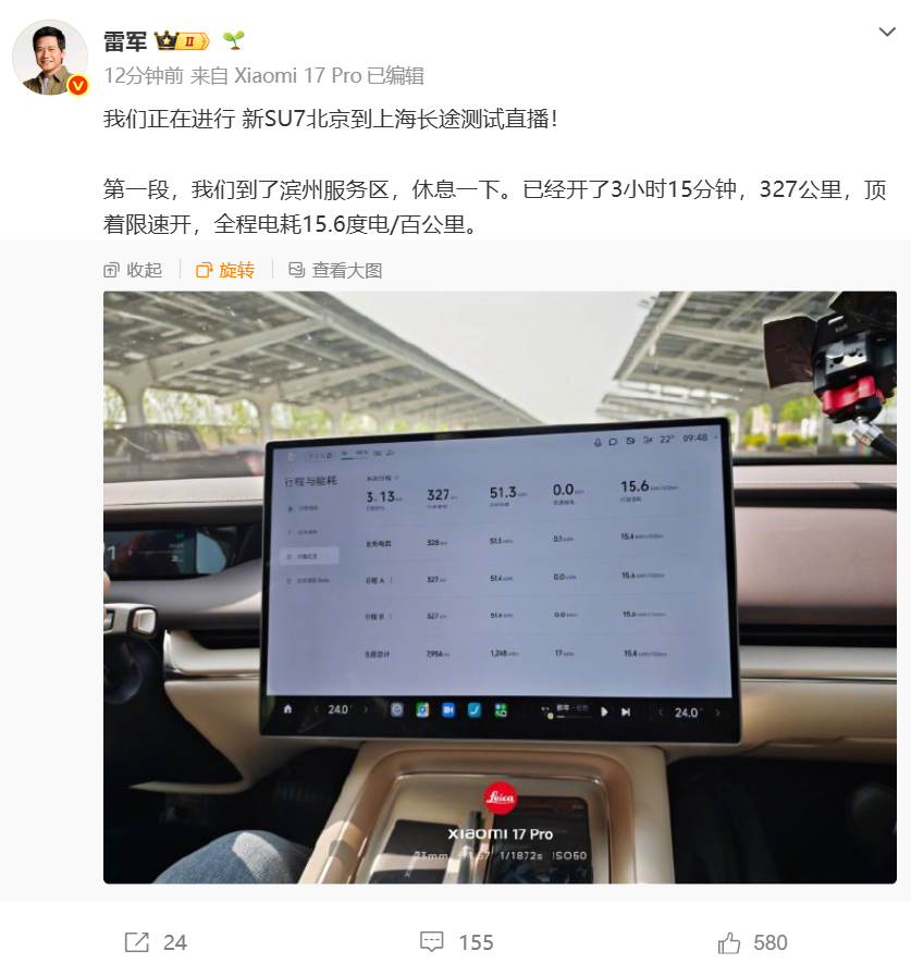 4月17日6时33分,雷军在微博发文:“新SU7 长途续航测试,北京到上海,1265公里。早上六点半出发。”