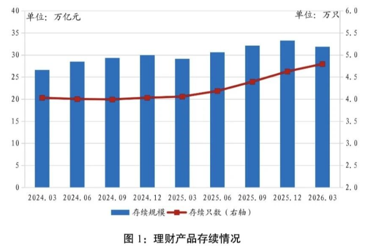 数据显示,截至2026年一季度末,全市场共存续理财产品4.80万只,同比增加18.23%;存续规模31.91万亿元,同比增长9.51%。