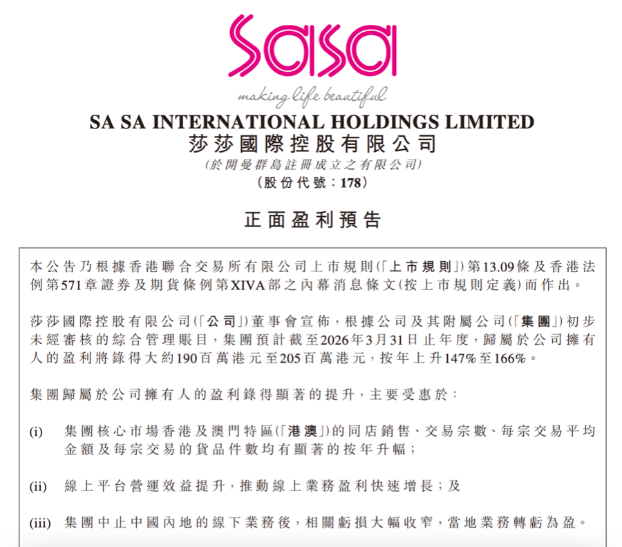 2026年4月15日,莎莎国际(00178.HK)发布正面盈利预告,预计截至2026年3月31日止年度,公司归母净利润约1.9亿—2.05亿港元,同比大幅增长147%~166%,创下近年最佳盈利表现。
