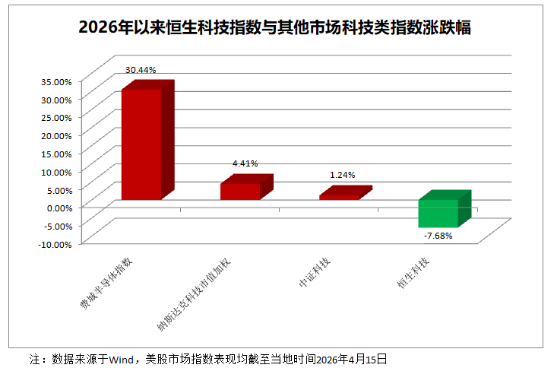 横向对比更明显:2026年以来,A股中证科技指数涨1.24%,美股纳斯达克科技市值加权指数涨逾4%,费城半导体指数更是大涨约三成,均远超同期恒生科技指数的跌幅。回看2025年,中证科技指数与纳斯达克科技市值加权指数涨幅均超三成,与恒生科技指数的差距进一步拉大。