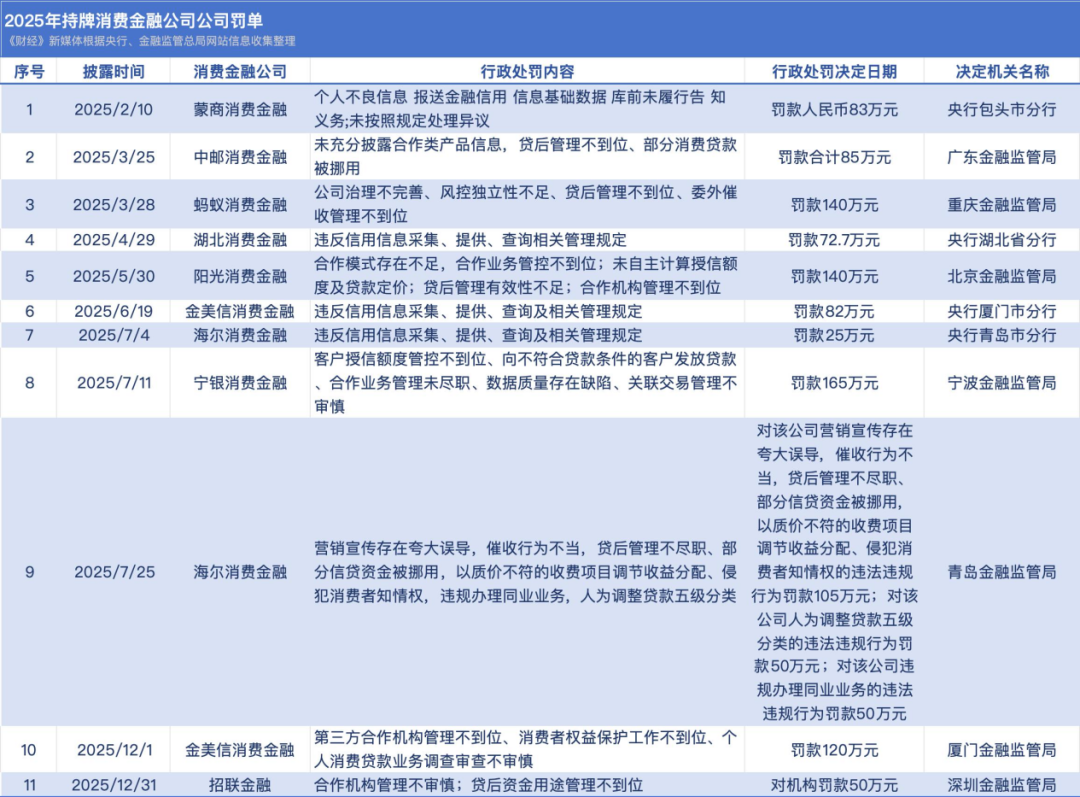 2025年,持牌消费金融公司共收到11张罚单。其中,宁银消费金融、阳光消费金融、招联金融、中邮消费金融、金美信消费金融的处罚事由,均提到合作模式、合作机构、合作管理等相关事项。