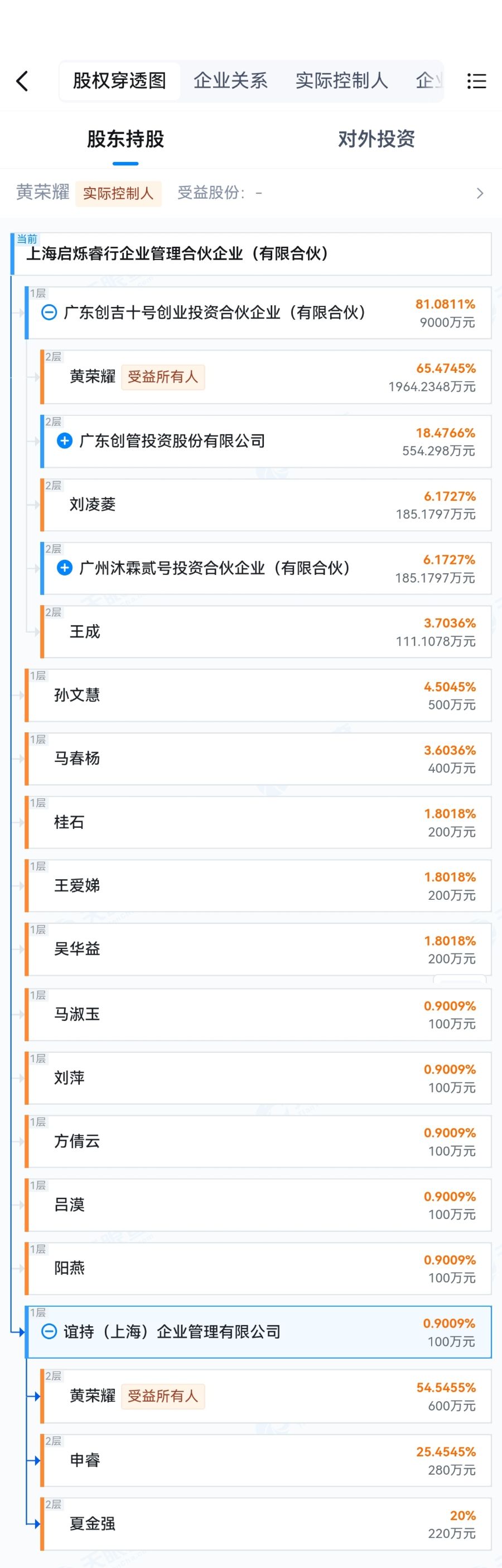 曹远刚虽然没有提黄荣耀的合伙人团队具体是谁,但天眼查显示,上海启烁的执行合伙人名为谊持(上海)企业管理有限公司(简称“谊持上海”),是广东创管投资成员。谊持上海背后合计有三个自然人股东,黄荣耀持股 54.55%,申睿持股 25.45%,夏金强持股 20%。