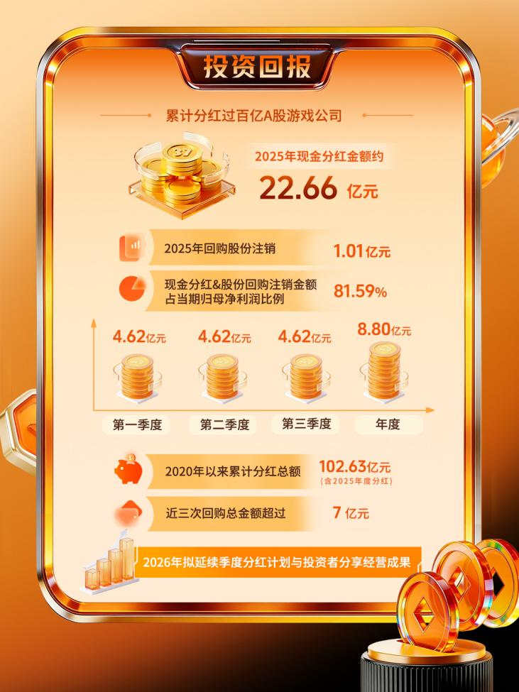 同时,三七互娱还发布了2025年度利润分配预案。公告显示,三七互娱2025年度拟向全体股东每10股派送现金股利4.0元(含税),派发后2025年全年每10股派送现金股利合计将达10.3元(含税)。