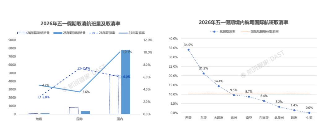 燃油附加费上涨带来的直接影响是:不少航线被取消。航班管家最新统计数据显示,截至4月15日,2026年“五一”假期国际计划航班取消率为7.4%。国际计划航班中,境外航司的取消率约为0.1%,境内航司的取消率约10.7%,取消率偏高的主要区域为西亚、东亚、大洋洲,取消率分别为34.0%、21.2%、14.4%。