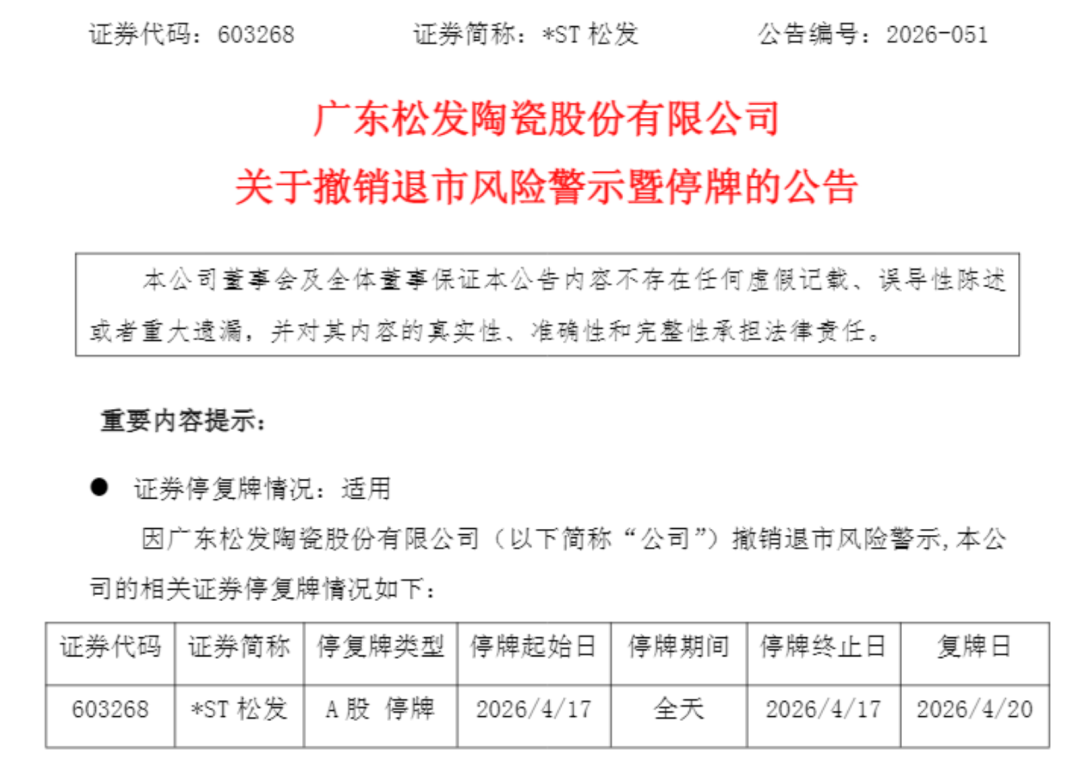 4月16日晚间,*ST松发公告称,公司股票将于4月17日停牌一天,自4月20日起复牌交易并撤销退市风险警示。公司证券简称由“*ST松发”变更为“松发股份”,股票价格的日涨跌幅限制由5%变为10%。