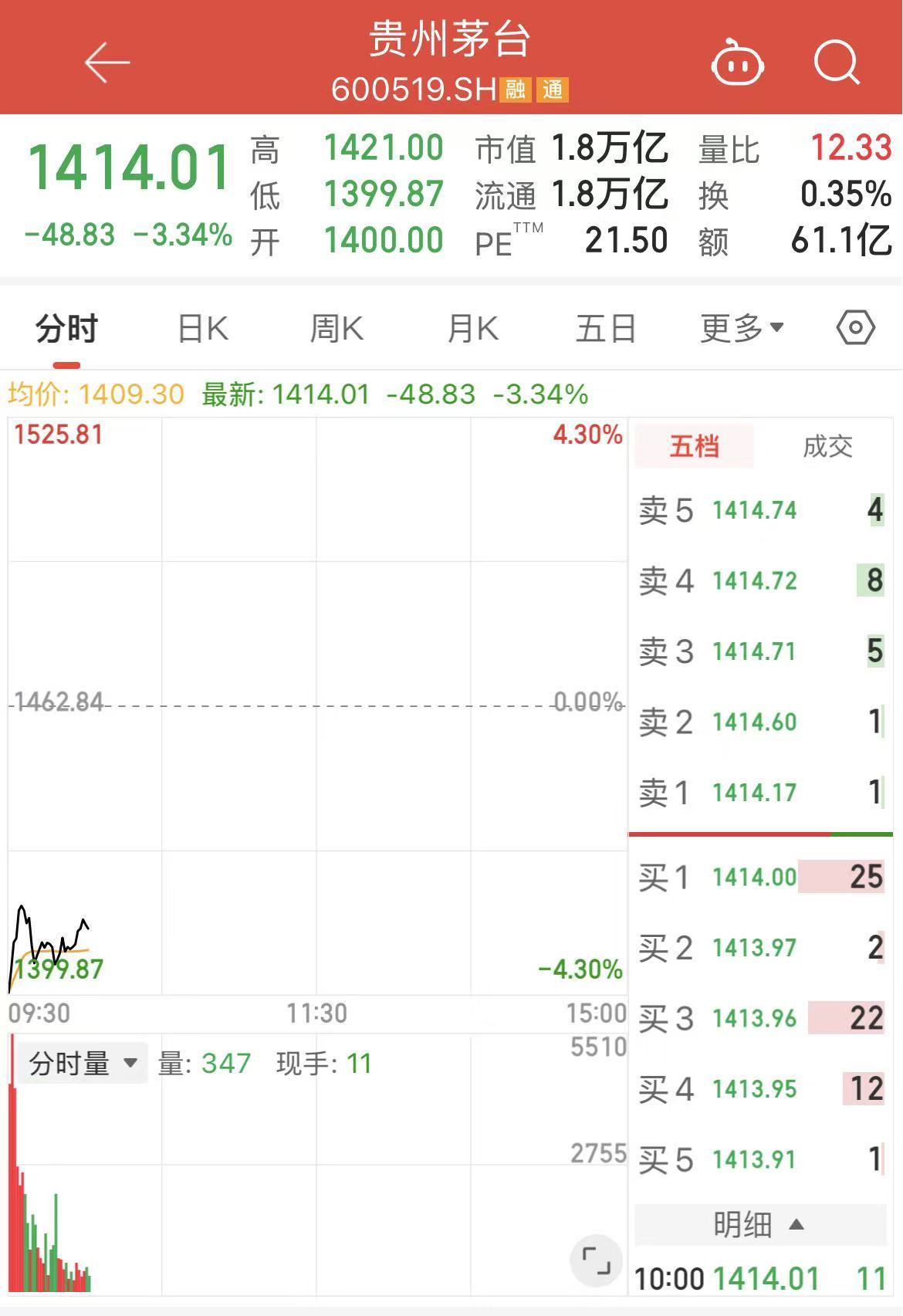 4月17日,白酒龙头股贵州茅台股价跳水,开盘大跌4.3%,盘中股价被源杰科技超越,跌落股王宝座。截至10时整,贵州茅台报1414.01元/股,跌幅为3.34%。