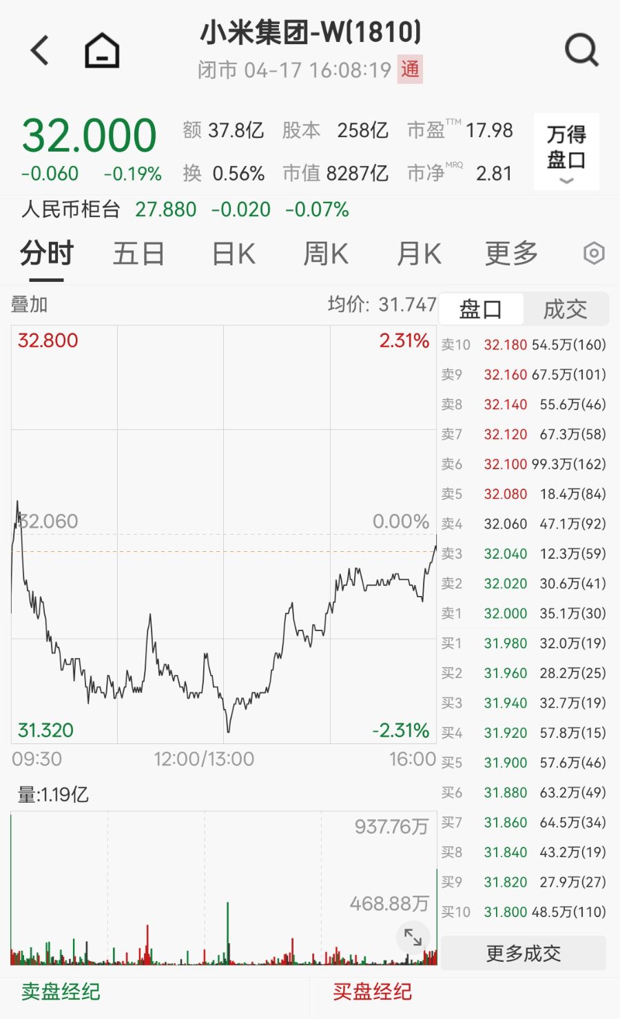 股价方面,截至4月17日收盘,小米集团报32港元/股,收跌0.19%,最新总市值为8287亿港元。