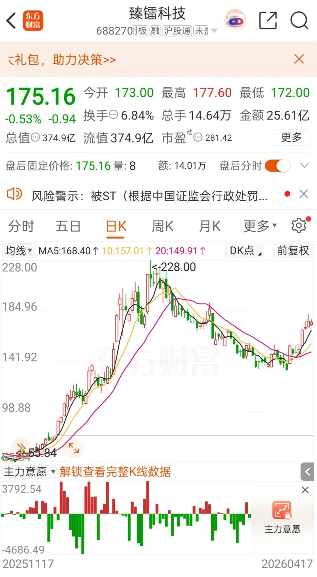 截至4月17日收盘,臻镭科技报175.16元/股,股价下跌0.53%,总市值为374.9亿元。