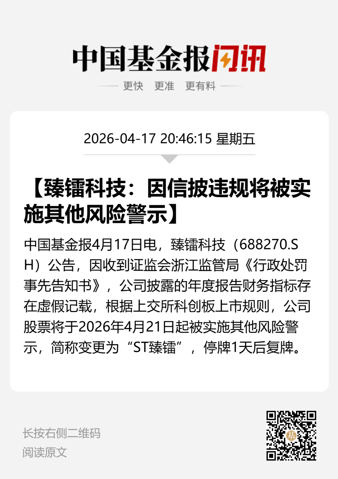 4月17日晚间,臻镭科技(证券代码:688270)发布公告称,公司当日收到中国证监会浙江监管局下发的《行政处罚事先告知书》,因2022年财务报告存在虚假记载,根据科创板上市规则,公司股票将于4月20日停牌,4月21日起复牌并被实施其他风险警示,证券简称变更为“ST臻镭”。