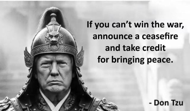 网络“唐子热梗”有一条就这样说嘛:如果你赢不了战争,就宣布停火,然后将和平的功劳归于自己。