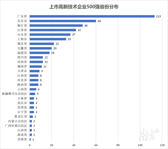 暨南大学产业经济研究院发布的数据显示:广东拥有上市高新技术企业624家,其中113家进入全国500强,两项指标均位列全国第一。