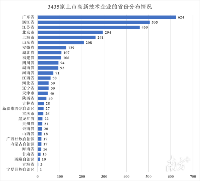 在暨南大学产业经济研究院选取的全国3435家上市高新技术企业样本中,广东以624家稳居首位,占比接近五分之一,与浙江、江苏共同构成中国高新技术企业最为集中的三大板块。