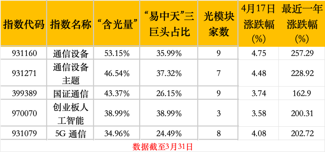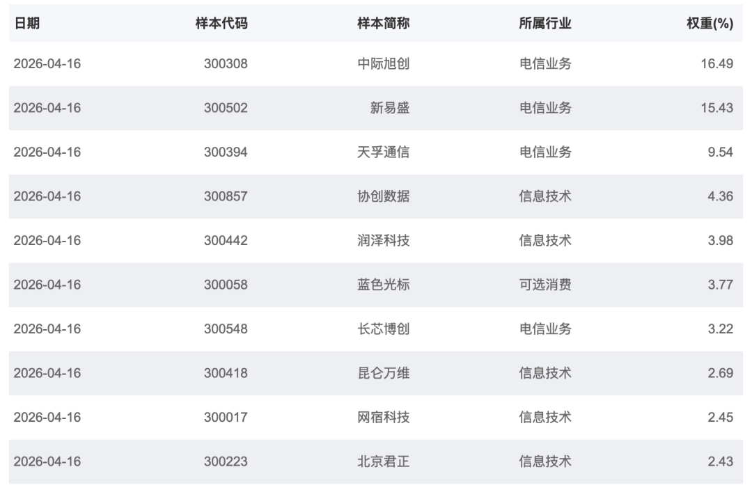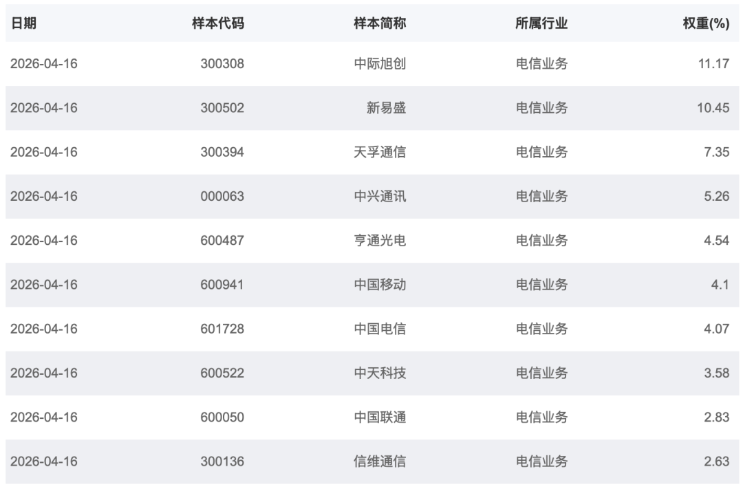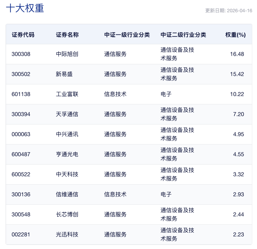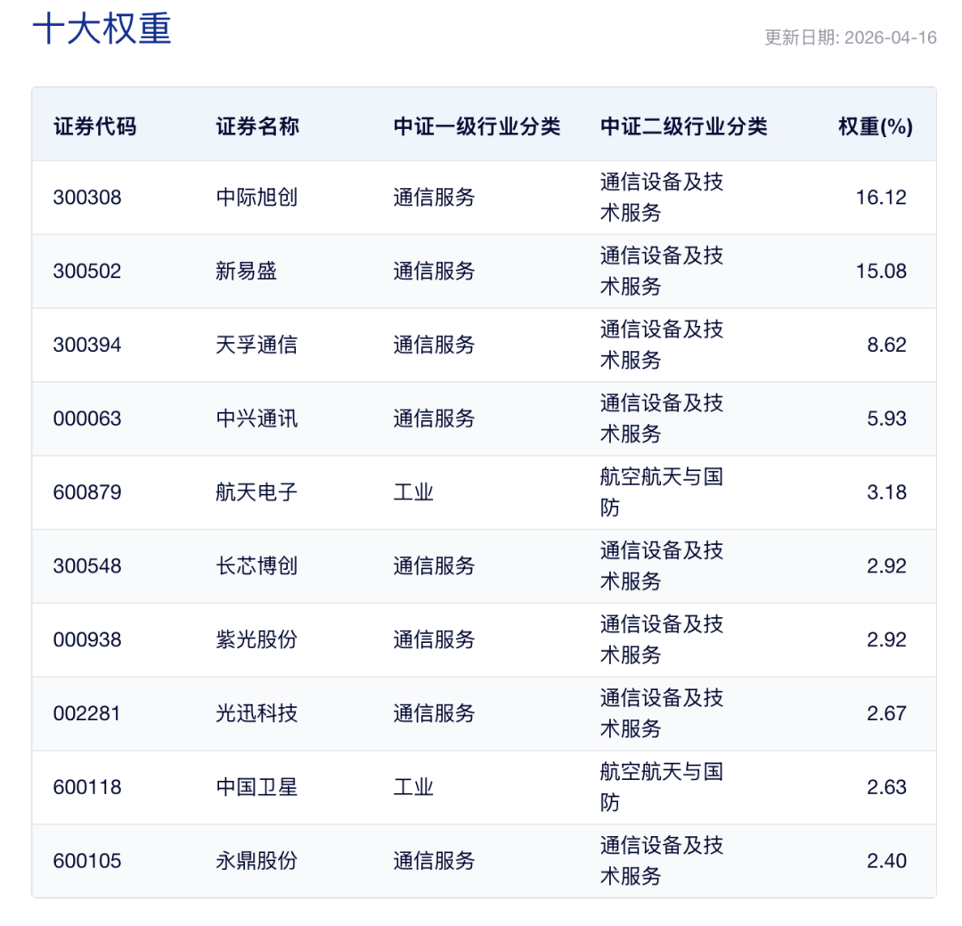 中证通信设备主题指数 (931271) :中证通信设备主题指数选取50只业务涉及通信设备制造、通信技术服务以及卫星互联网建设等领域的上市公司证券作为指数样本,反映通信设备主题上市公司证券的整体表现。截至4月16日,“易中天”占据前三大权重股,合计占比超过37%。