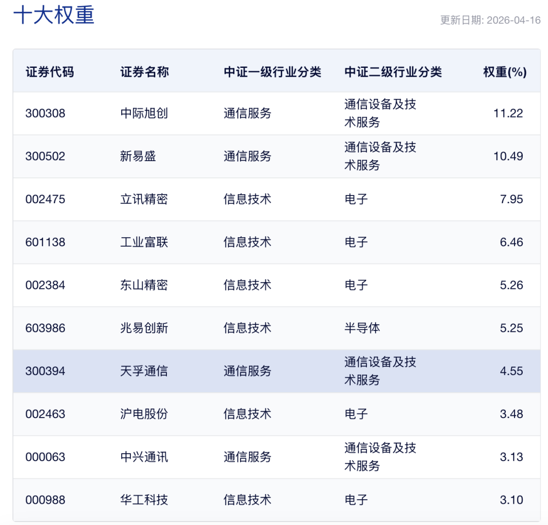 根据4月16日的前十大权重股数据,仅“易中天”就占据了该指数近40%的权重。适合希望高度聚焦光模块赛道,追求行业弹性的投资者。