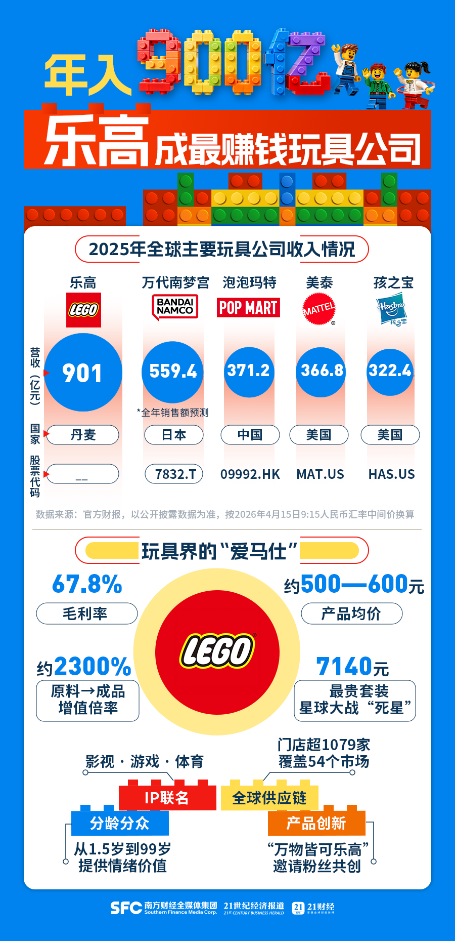 乐高集团2025年财报显示,营收同比增长12%至835亿丹麦克朗(约合901亿元人民币),是泡泡玛特的2.4倍,再次成为最赚钱玩具公司。值得注意的是,乐高2025年毛利率高达67.8%,相当于每卖100块钱的东西,就能赚近68块的毛利。对比一下,美泰(芭比娃娃母公司)的毛利率只有48.7%。