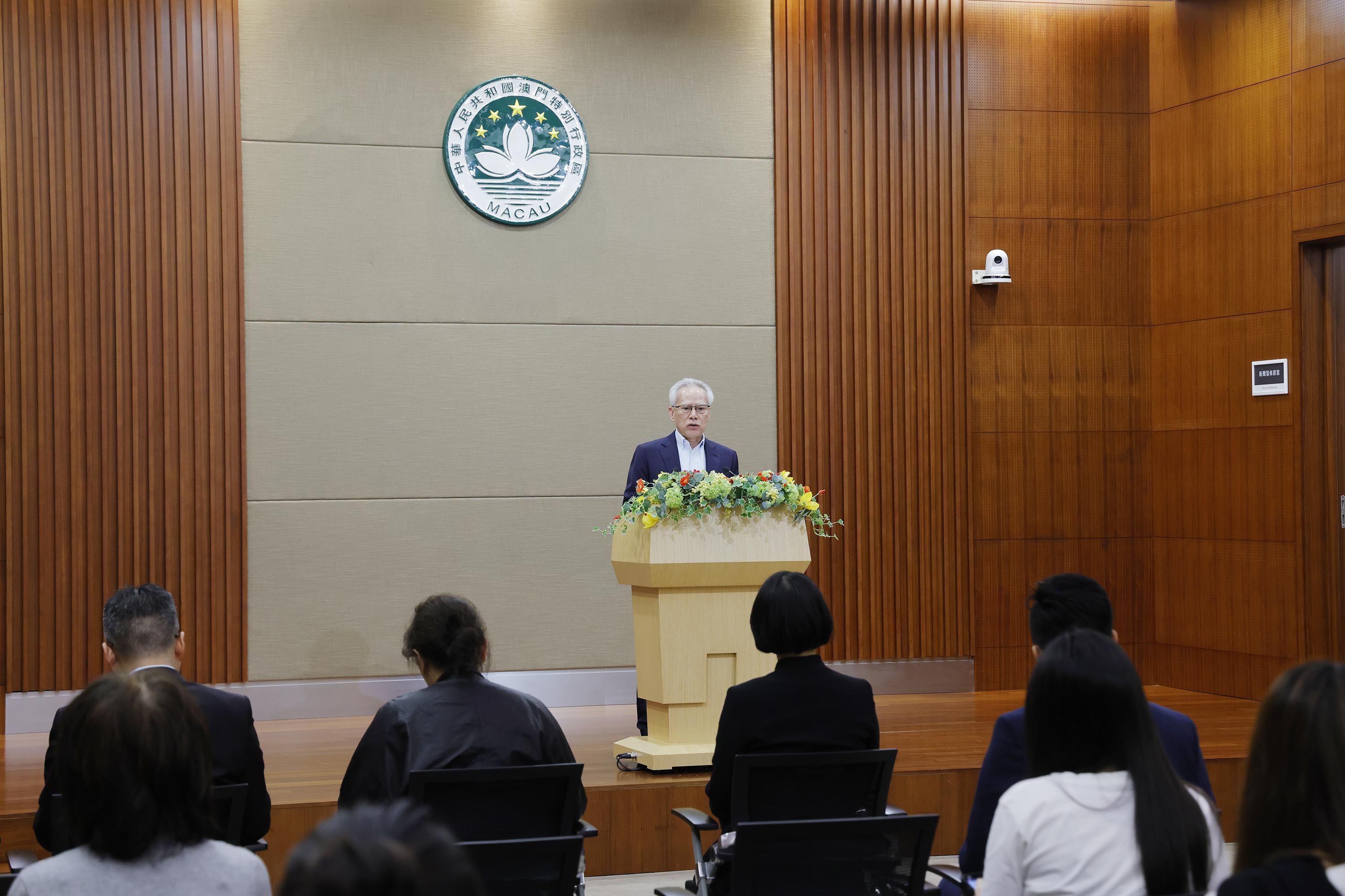 澳门特别行政区行政长官岑浩辉在启程访问葡萄牙、西班牙、瑞士及比利时前,于港珠澳大桥澳门口岸举行记者会。