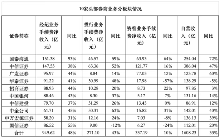 按照“自营收入=投资收益+公允价值变动-对联营合营企业投资收益”口径计算,前十强券商自营业务收入合计约1608亿元,同比增长33%,占合计营收比重约44%。前十强经纪业务手续费合计为949.62亿元,同比增长48%,占合计营收比重为26%。