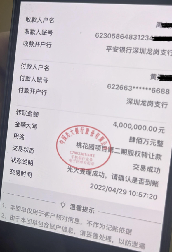 黄先生说,2600多万元直接转入周某个人名下,双方完成了股权变更手续。如今,黄先生依旧是深圳市伍洲置地有限公司的股东,占股20.41%。