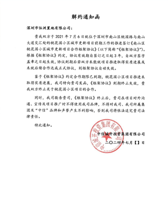 当日下午,记者致电中信城开公司核实桃花园小区旧改情况,对方表示并不掌握。但根据一份2024年中信城开投资集团有限公司发给深圳市伍洲置地有限公司的解约通知函,函件中称“鉴于《框架协议》约定合作期限已到期,桃花园小区项目推进未取得实质进展,我司特向贵司发函,《框架协议》到期终止失效,贵我双方终止关于桃花园小区项目的合作”。