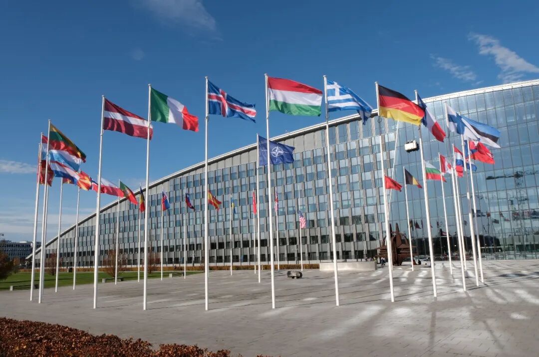 这是2025年11月5日在比利时首都布鲁塞尔拍摄的北约总部大楼外的北约及成员国旗帜。新华社记者 张兆卿 摄